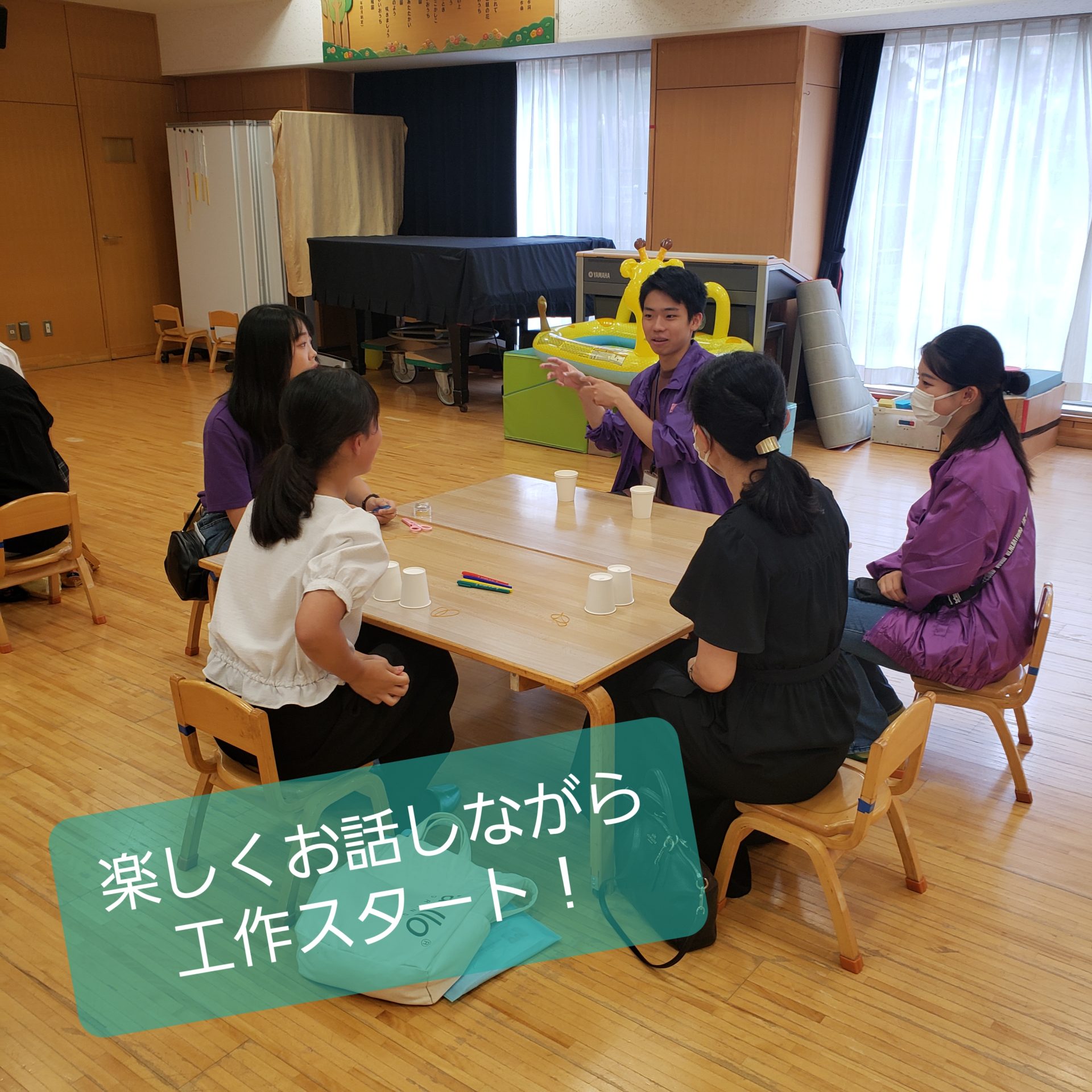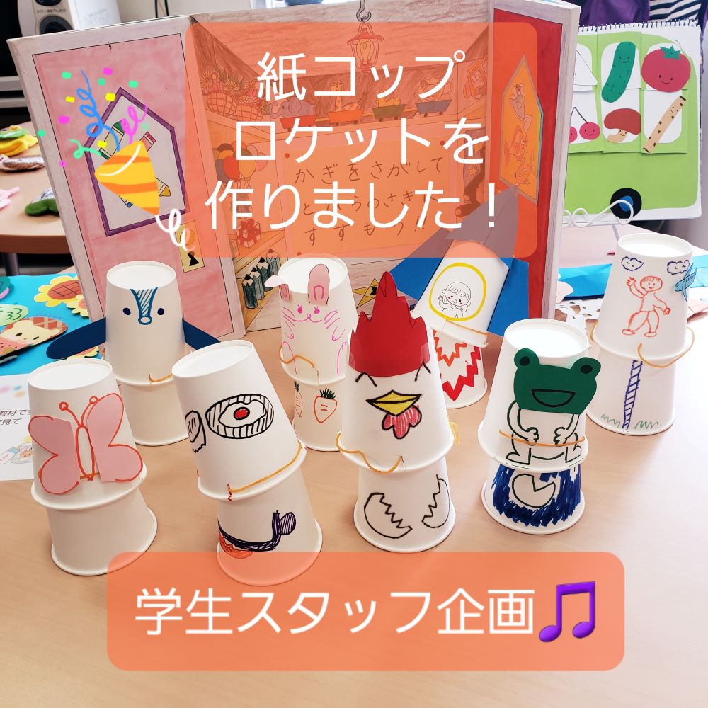 3つのテーブルに分かれ、高校生と大学生が交流しながら紙コップロケットを作りました。子どもと作る時の注意やポイントも解説し、アイデア溢れる作品が出来ました!