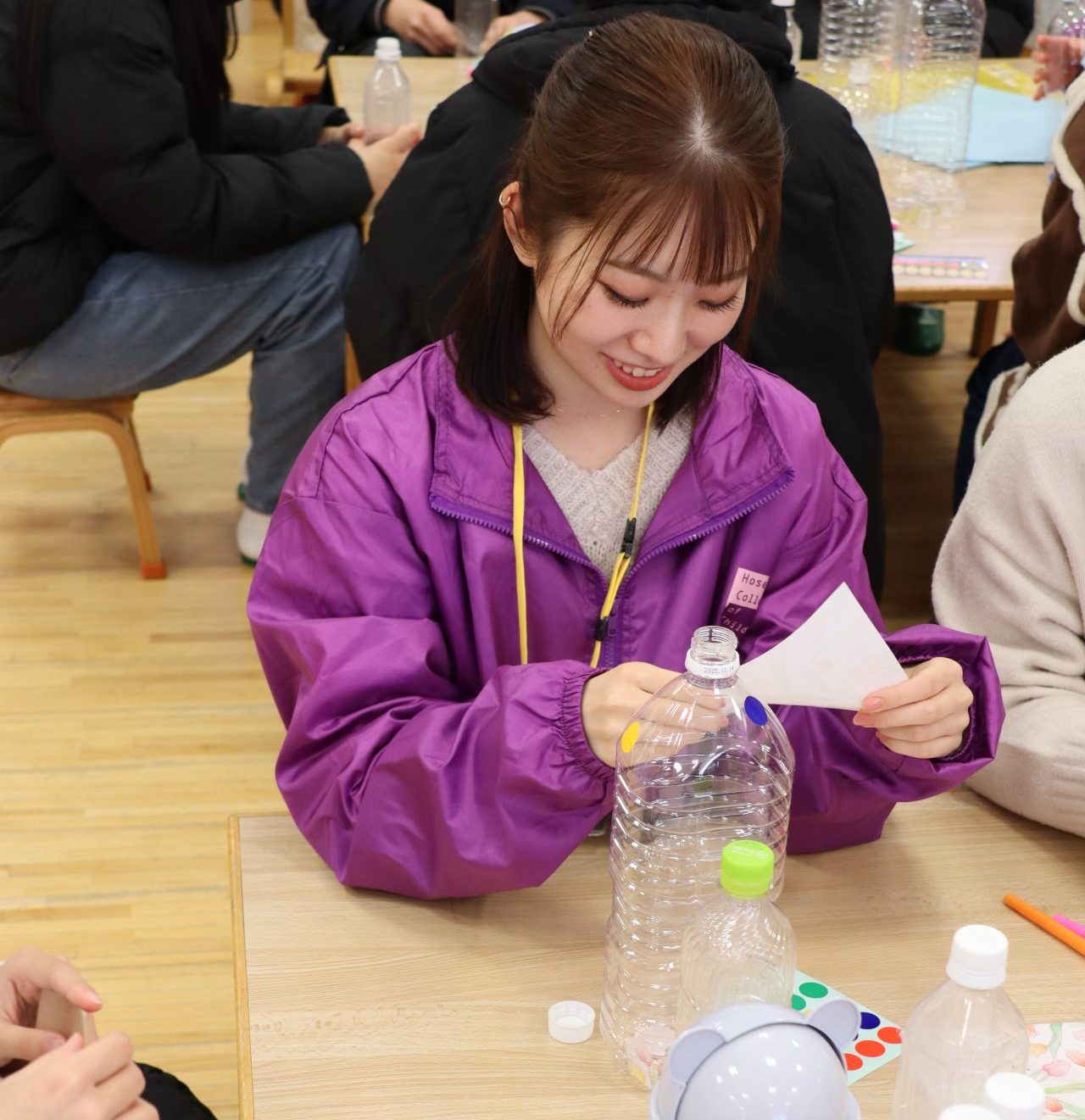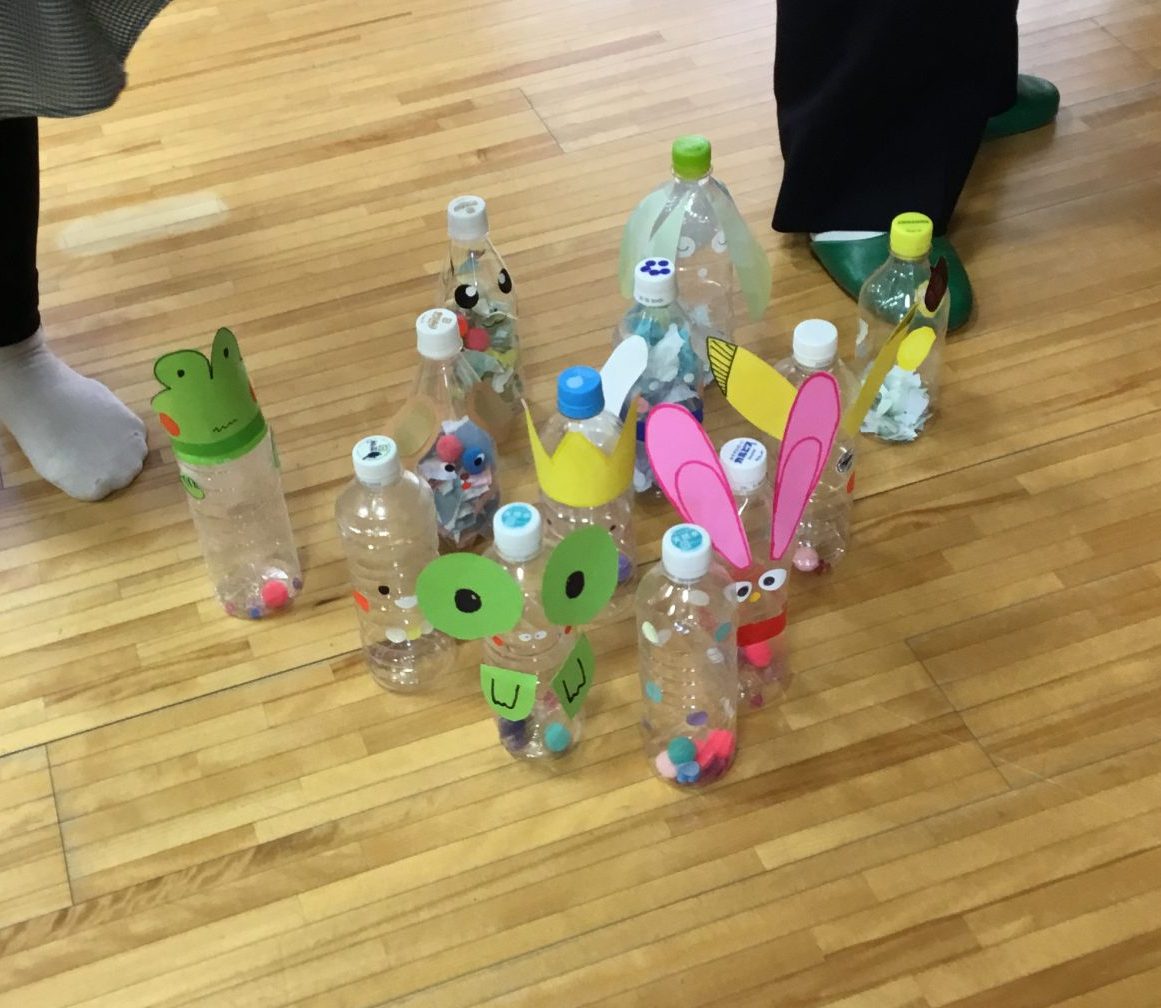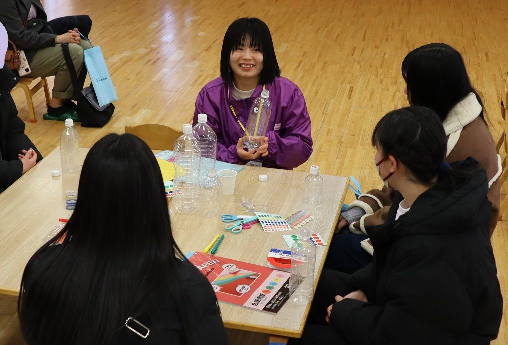 学生スタッフがペットボトルボーリングの作り方を説明。あわせて保育現場で工作する時に使える材料などを紹介しました。