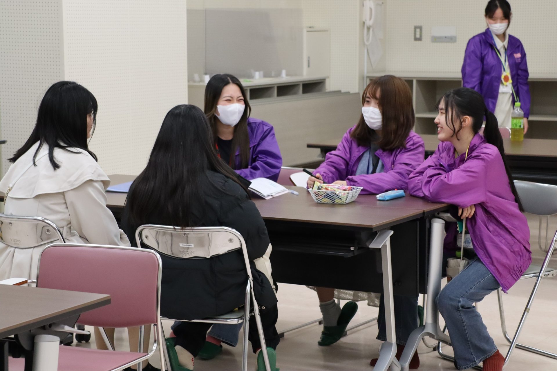 4テーブルに分かれて、学生スタッフが高校生とお話をしながら一緒にボーリングのピンを制作。最後に2チームに分かれて、どちらのチームが多くピンを倒せるか対戦しました!
