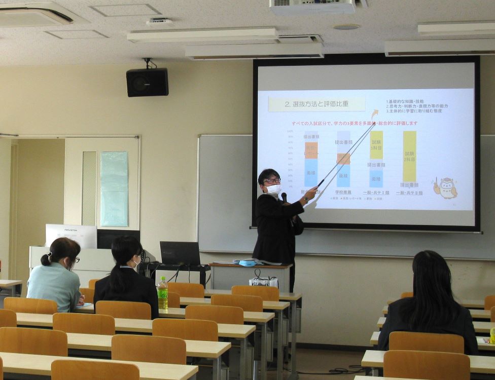前半、本学の入試概要を説明。後半は教員が学生2人にインタビューする形式で進行しました。