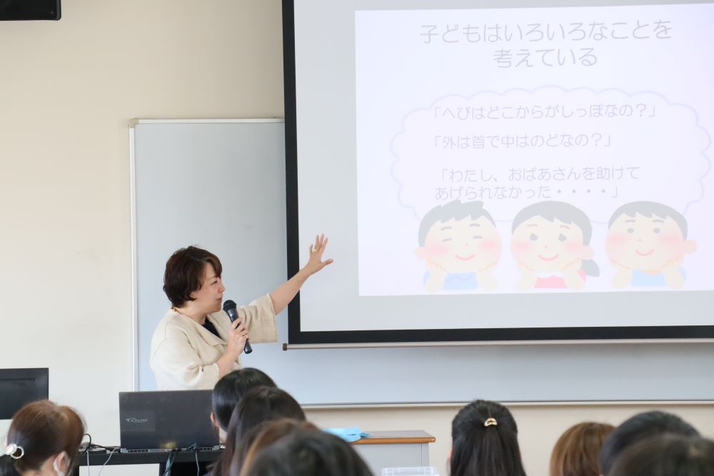 具体的な事例を交えながら保育の面白さをお話し、本学の実習システムを説明しました。