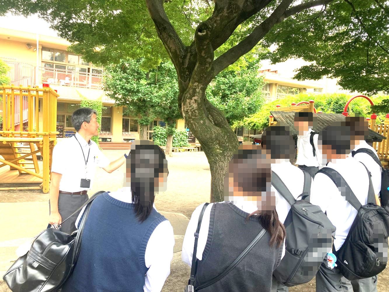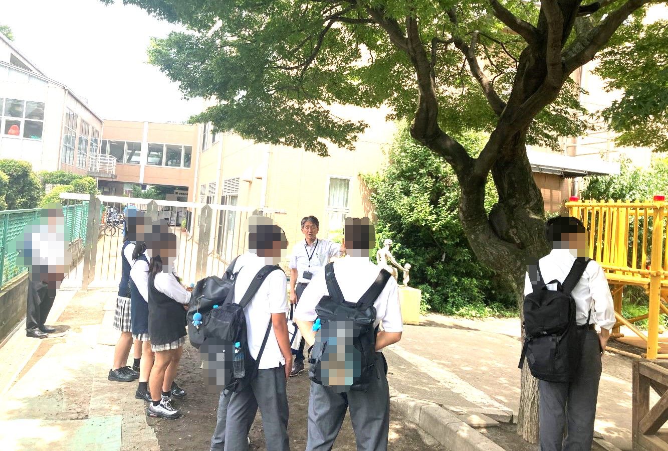 隣接する宝仙学園幼稚園のご案内です。皆さま、熱心に話を聞いて見学していました。