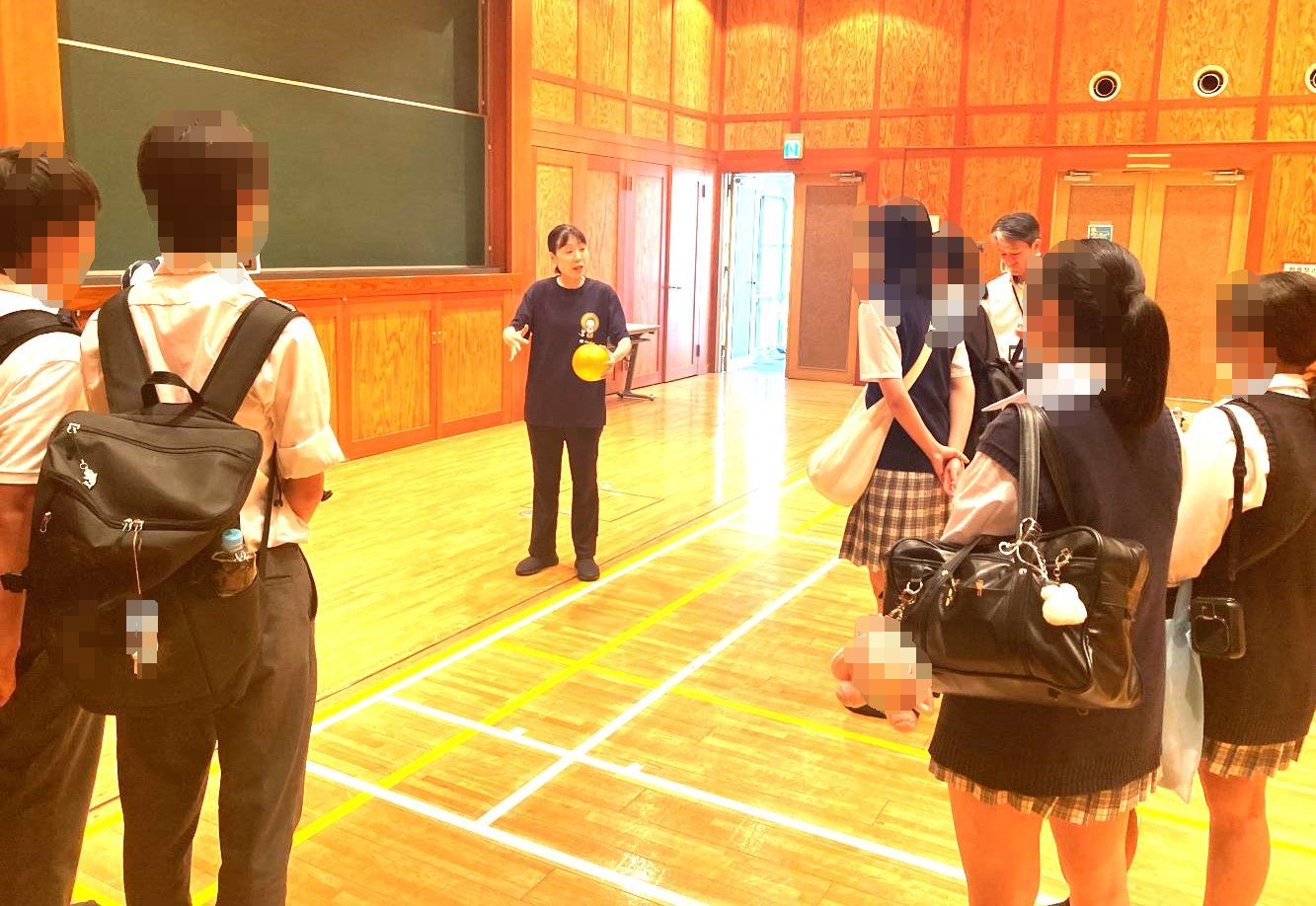 大学4号館 体育館です。「身体遊び実践論」を見学し、塩野谷先生のお話を聞いて頂きました。