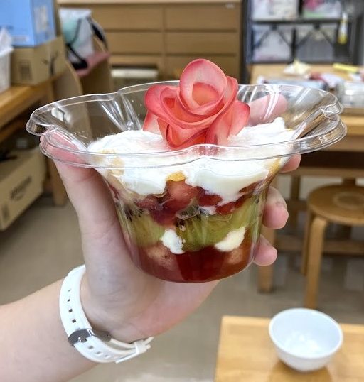 ・初めてフルーツトライフルを作って難しい部分(リンゴのバラ)もあったけれど、学生の方が優しく教えてくれて、上手に作ることができました、楽しかったです。