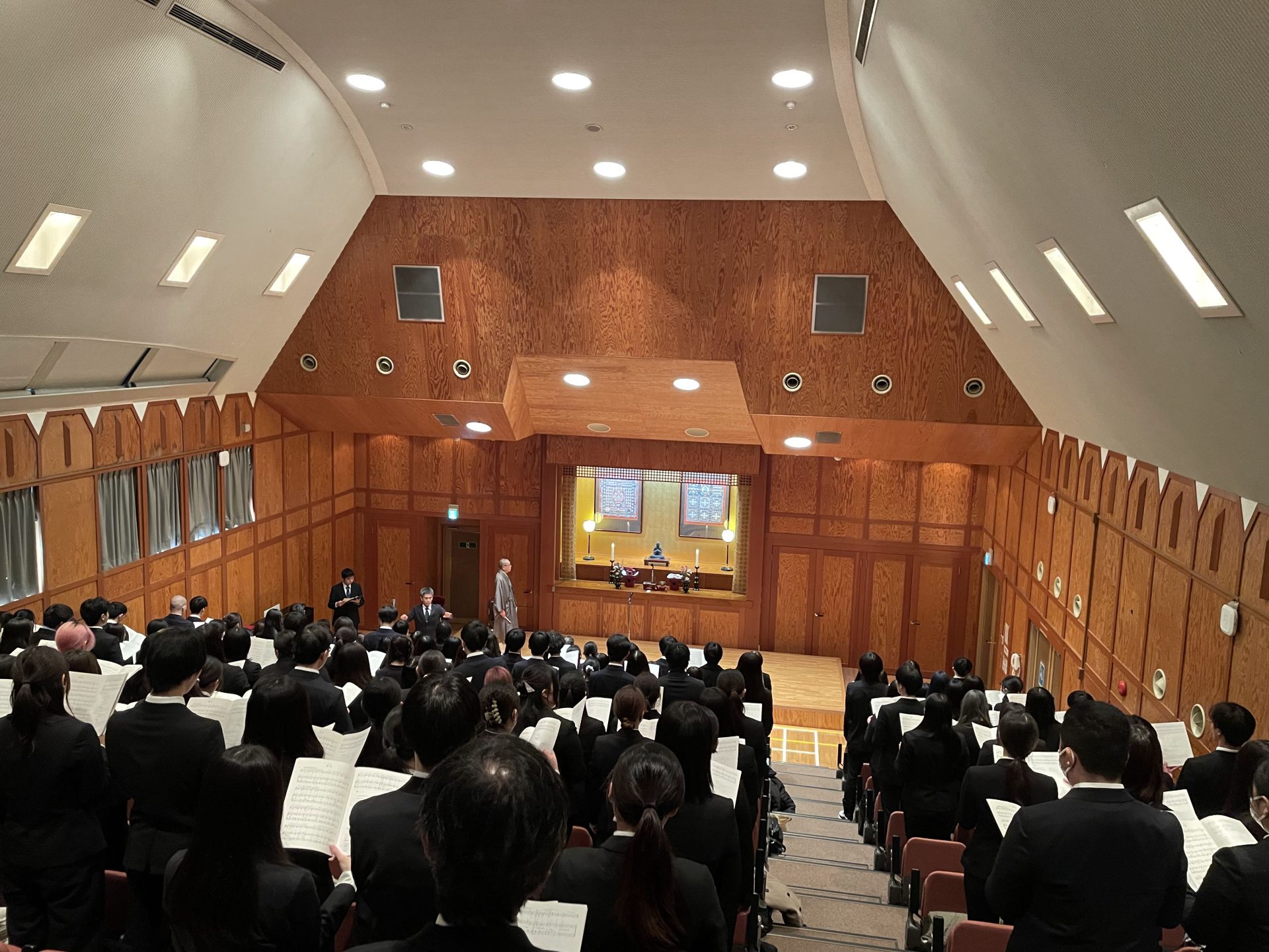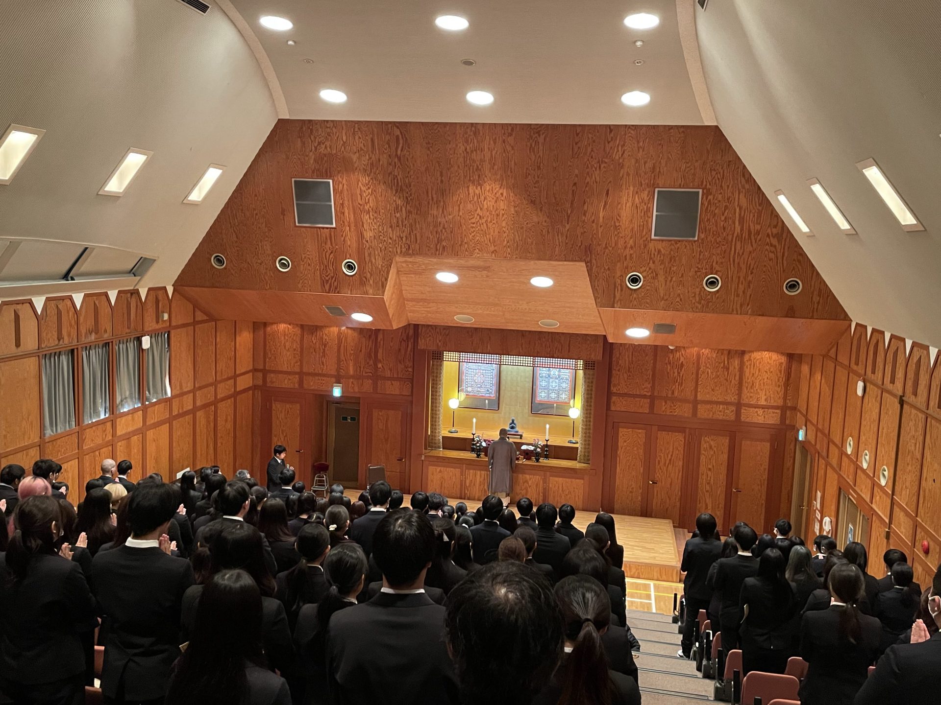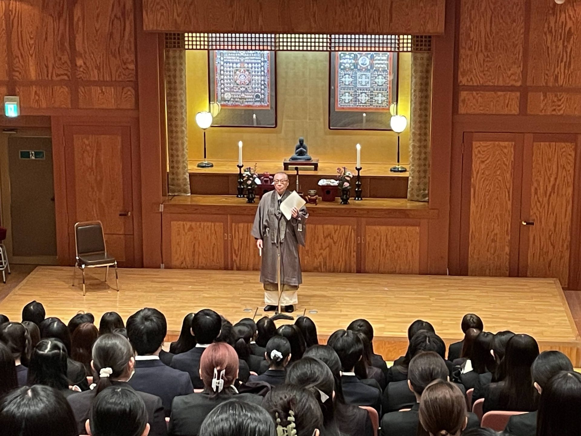 式典では本学園理事長・宝仙寺住職、冨田道生先生から、ご法楽、そして成道会にちなんだご法話をいただきました。ご法話では聖地高野山に関するお話、さらに、興教大師覚鑁上人さまについてのエピソードをご教示いただきました。今年は1、4年生が一堂に会し、歌唱の幅も広げられ、今後の学びに生かせる経験となりました。