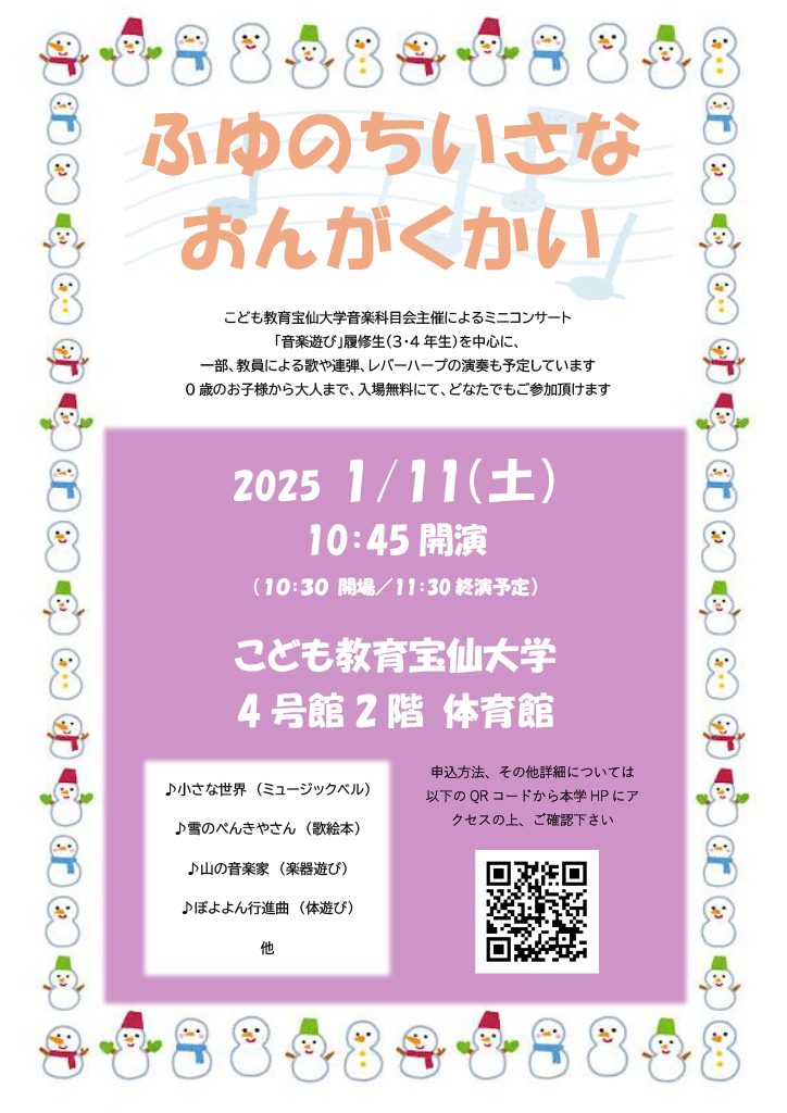 こども教育宝仙大学音楽科目会の主催によるイベント「ふゆのちいさなおんがくかい」を下記の要領で開催致します。内容をご確認の上、お気軽にお申込み下さい。