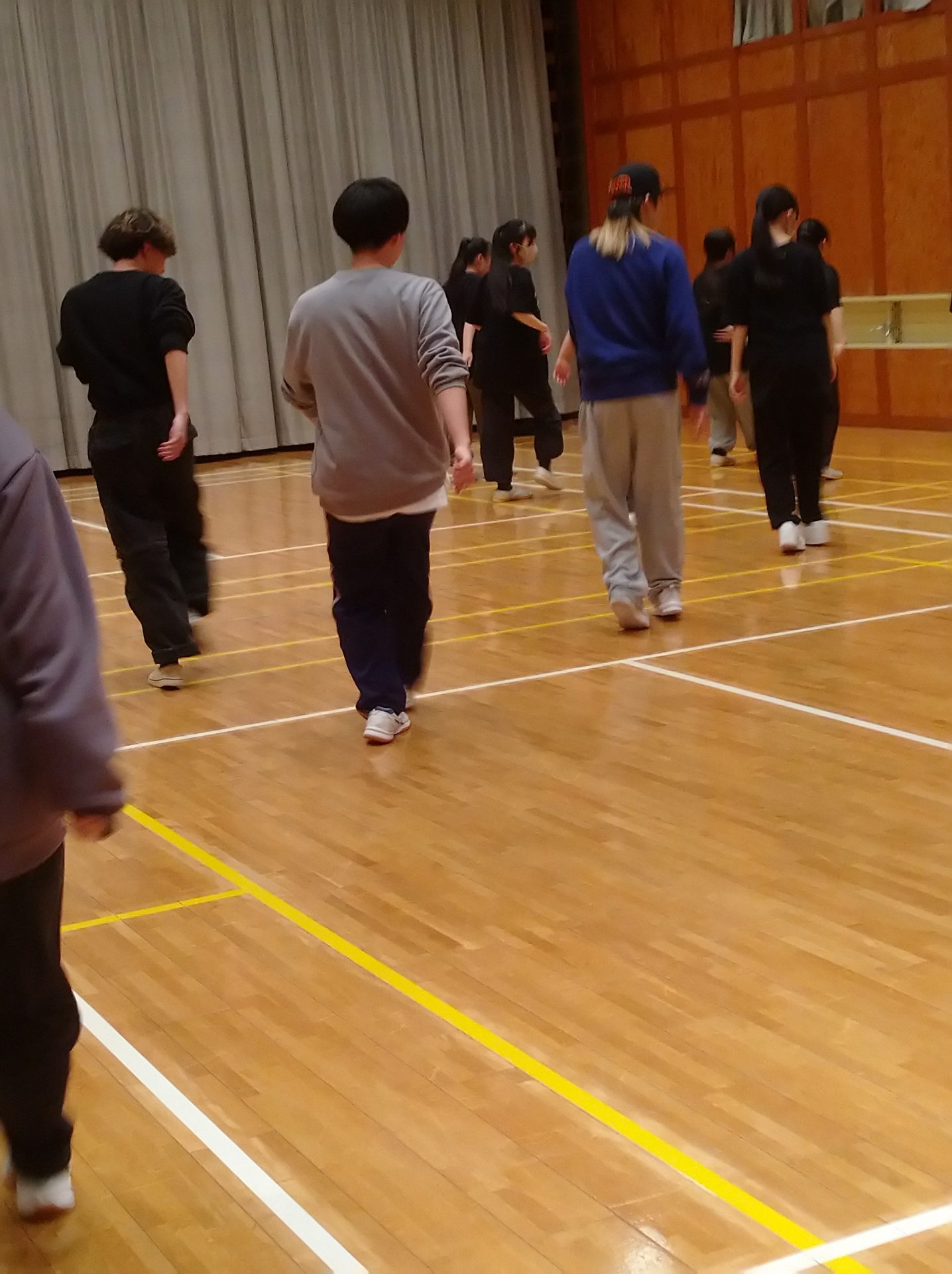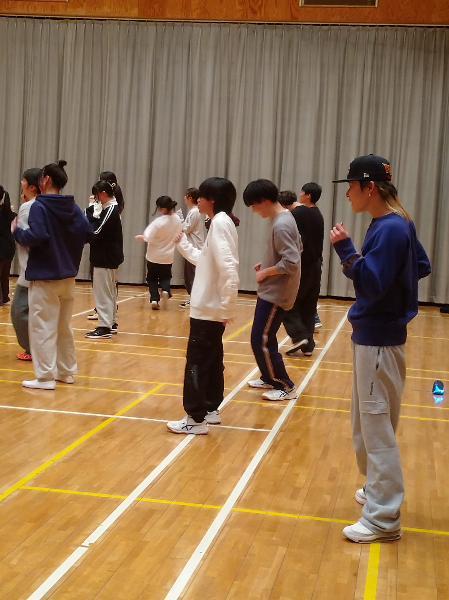高校生と大学生混合のグループを作り、最後のフレーズの振りを各グループオリジナルで創作し、発表しあう場面もありました。