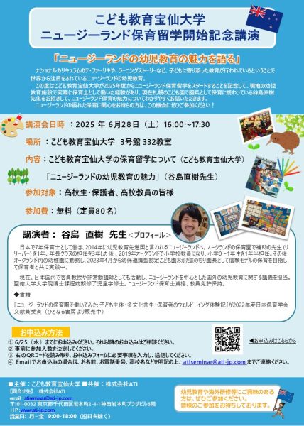 今年度よりこども教育宝仙大学が「ニュージーランド保育留学」をスタートすることを記念し、以下内容で講演会を行います。
