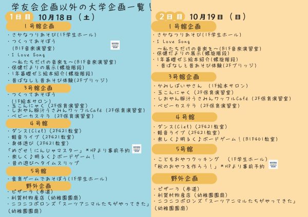 今年度も模擬店や展示、音楽・ダンス・児童劇のパフォーマンスに加え、こども向けの様々な体験イベントが行われます。
